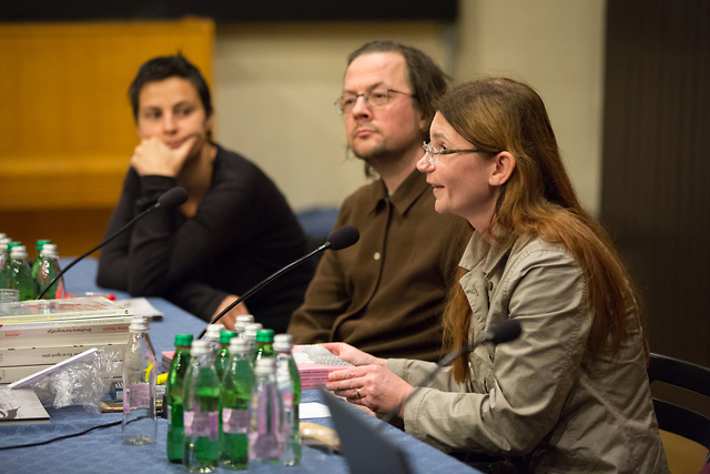 Simona Semenič, Gašper Malej in Amelia Kraigher na predstavitvah knjig v okviru 52. FBS.