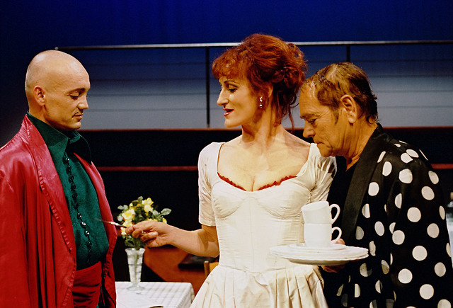 Saša Pavček (Mirandolina), Vojko Belšak (Vitez) in Livij Bogatec (Markiz) v Krčmarici Mirandolini Carla Goldonija v režiji Katje Pegan in produkciji Gledališča Koper.