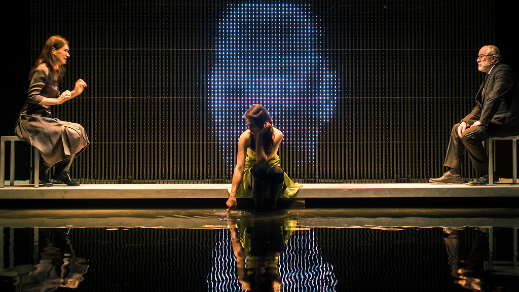 Petra Govc, Janez Hočevar in Saša Pavlin Stošić v uprizoritvi Prevzetnost in pristranost: Prizorišče dvojega po besedilu Jane Austen, Eve Mahkovic in Alaina Badiouja v režiji Matjaža Bergerja ter produkciji Anton Podbevšek Teatra.