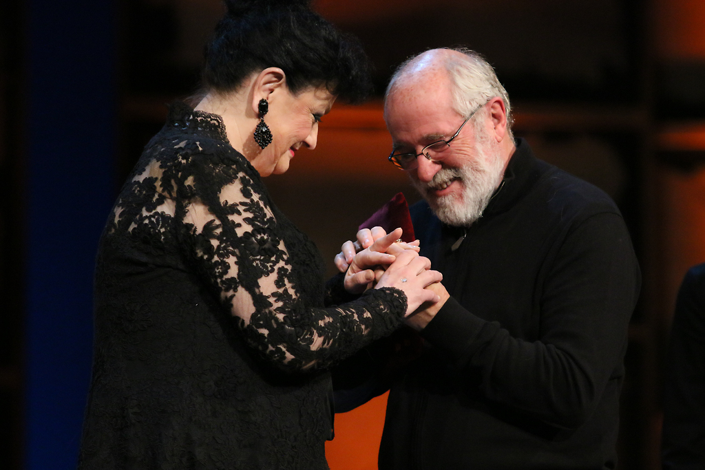 Ljerka Belak, prejemnica Borštnikovega prstana 2015, in Janez Hočevar, predsednik žirije za podelitev Borštnikovega prstana
