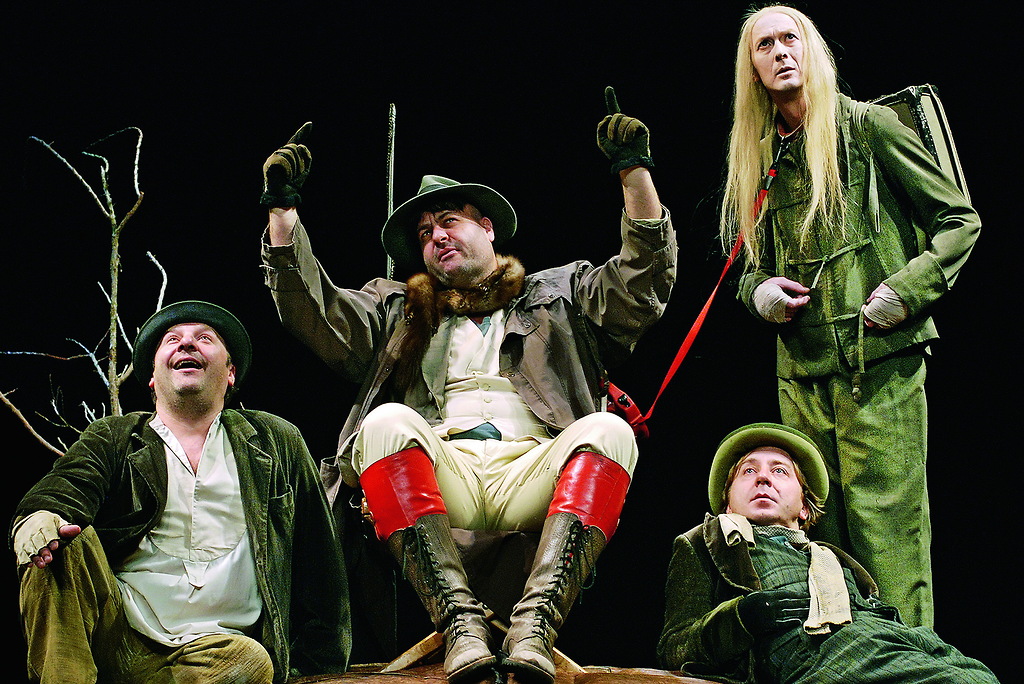 Na fotografiji: Bojan Emeršič (Estragon), Jernej Šugman (Pozzo), Gregor Baković (Vladimir) in Alojz Svete (Lucky) v uprizoritvi Čakajoč Godota Samuela Becketta v režiji Dušana Jovanovića in produkciji SNG Drama Ljubljana.